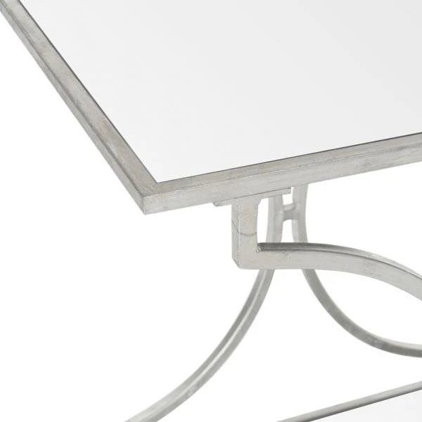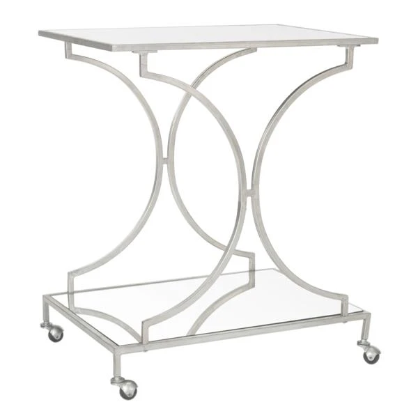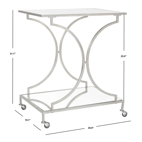 Stylish enough to be a living room side table, the portable Arden Bar Cart brims with old world luxury. With mirrored glass shelves and beautifully forged iron base in a lustrous silver finish, Arden is ready for dessert or beverage service.