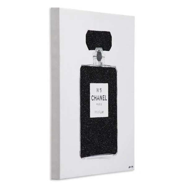 Featuring hand-applied glitter embellishments, this black-and-white image of Chanel No. 5 adds a stylish, glam note to the wall.
