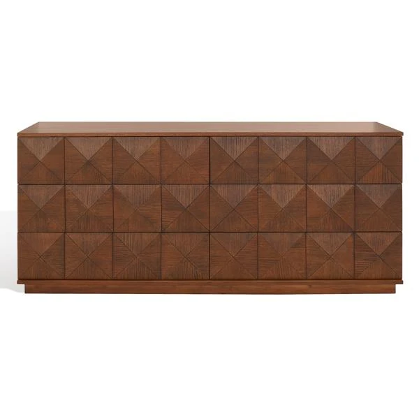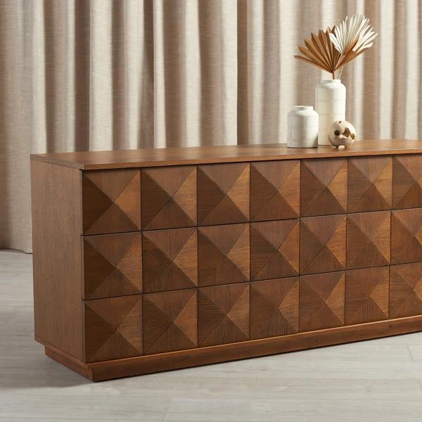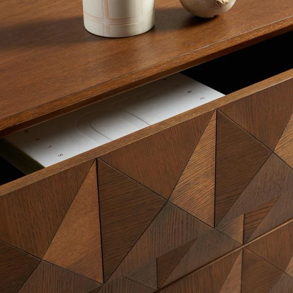 A textural delight, this eye-catching dresser is framed in kiln-dried hardwood and wrapped in rustic oak veneers with an expressive grain that beautifully highlights its faceted, dimensional design. Two push-latch drawers and an open shelf offer plenty of bedside storage.