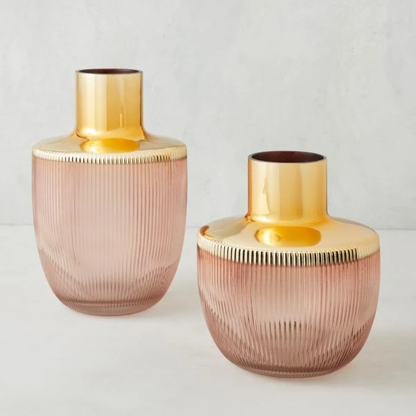 A gorgeous accent even when it’s not holding fresh blooms, this vase is crafted of blush-hued glass with a ribbed texture and gleaming gold top.