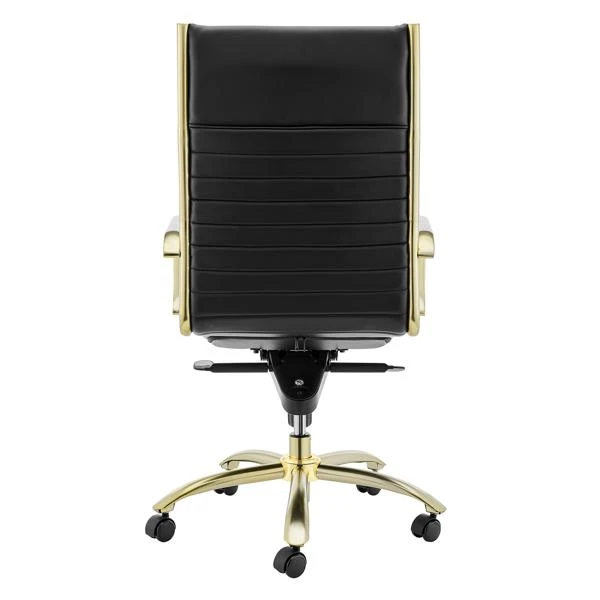 Designed with a high back, brushed gold tone frame, and channeled faux-leather upholstery, this desk chair brings both style and function to the home office. Constructed in one piece, its seat and back interior is wrapped in flat bungie banding for all-day comfort, while casters make the chair easy to move without damaging your floors.