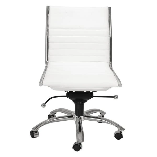 Designed with a chromed steel frame and channeled faux-leather upholstery, this desk chair brings both style and function to the home office. Constructed in one piece, its seat and back interior is wrapped in flat bungie banding for all-day comfort, while casters make the chair easy to move without damaging your floors.