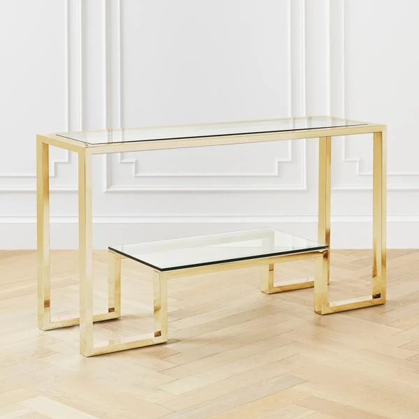 Duplicity collection is designed with form and function in mind. Constructed of stainless steel and glass, with a floating bottom shelf for clean and simple storage.