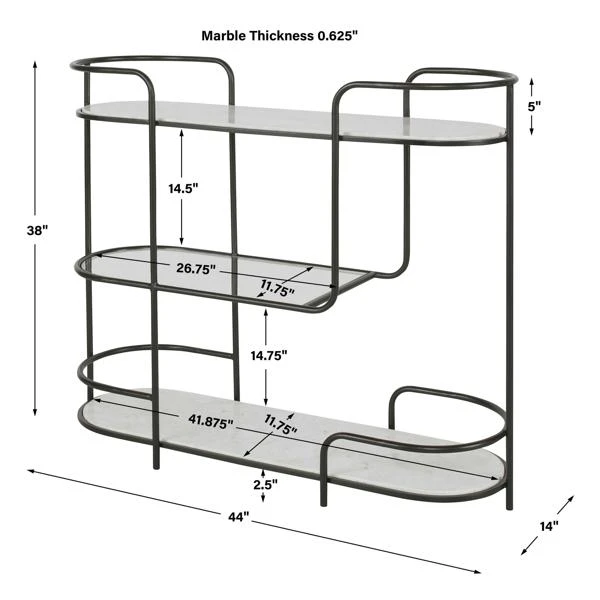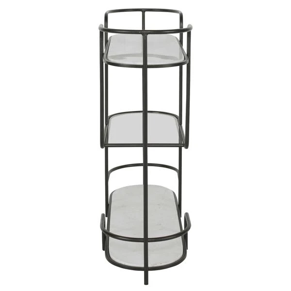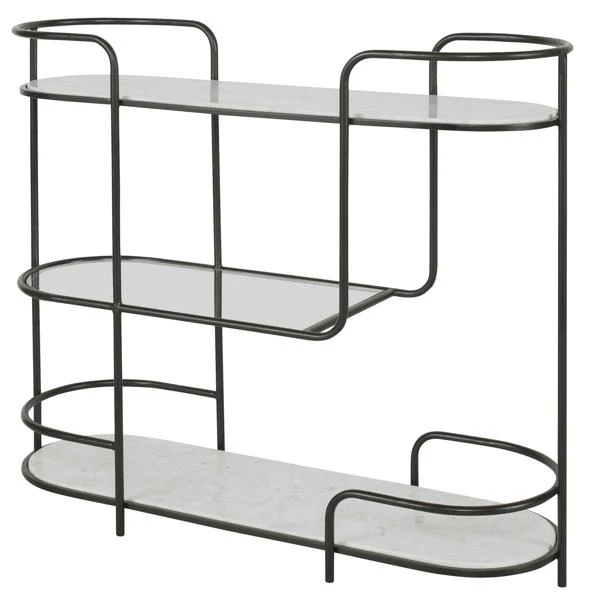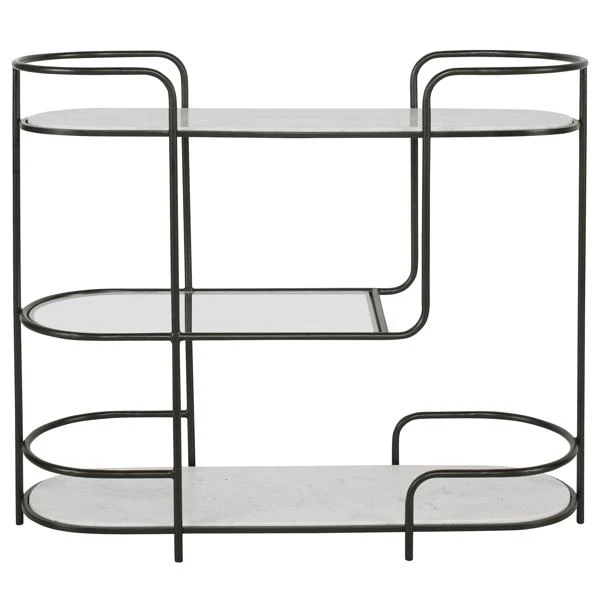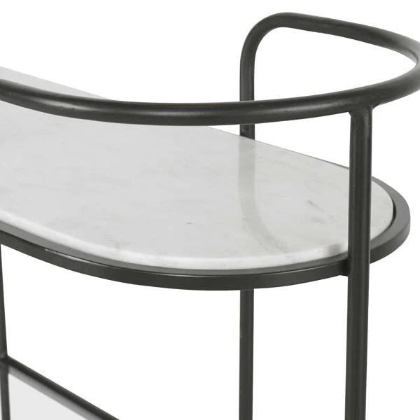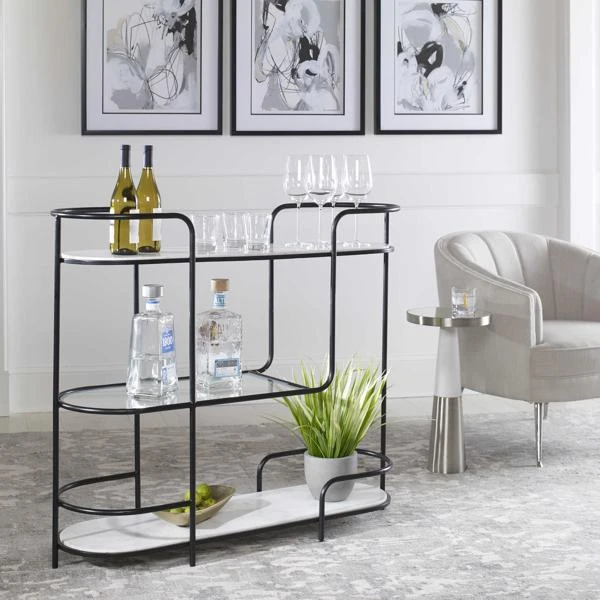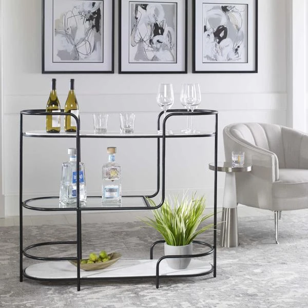 Inspired by a mix of classic mod design and contemporary styling, this multifunctional piece can serve as a bar, server, or console table. The curved iron frame is finished in satin black, accented by white marble and tempered glass shelving. Because of the natural characteristics of marble, each piece will have unique veining patterns.
