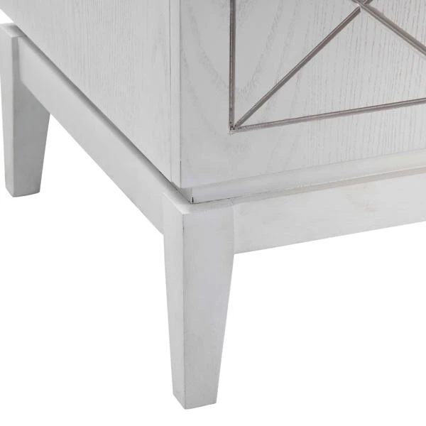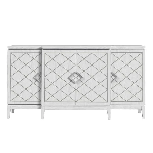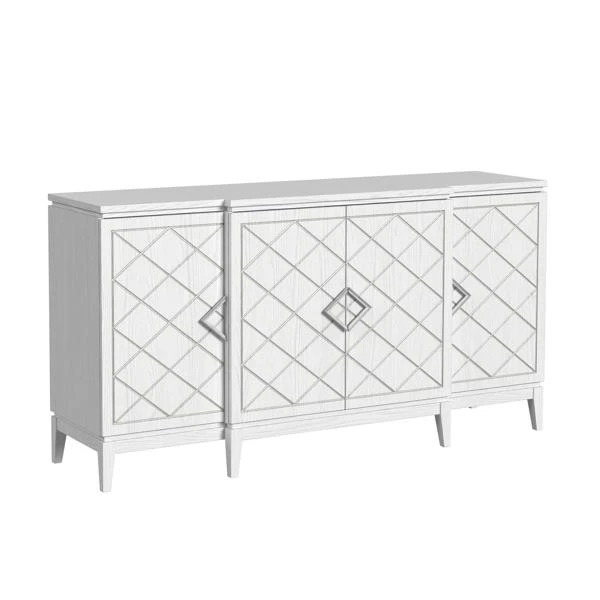 The Farah Server features four doors with three adjustable shelves and one drawer on full extension side glides . The server is constructed with rubberwood solids and flat cut oak veneers in a clean white stain and features a geometric routed pattern on the door fronts with a champagne finish accents and custom diamond shaped hardware.