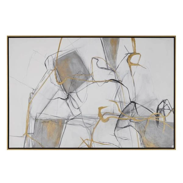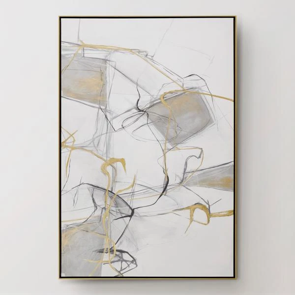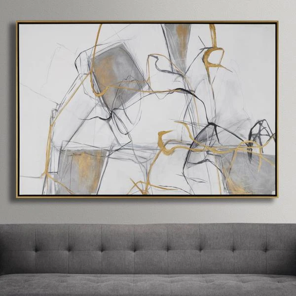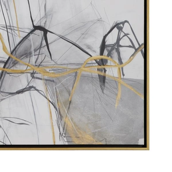 A sophisticated mix of metallic, inky black, and chic negative space. This abstract piece evokes curiosity without overpowering the room, even with its grand scale.