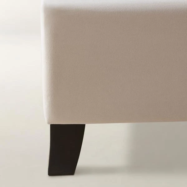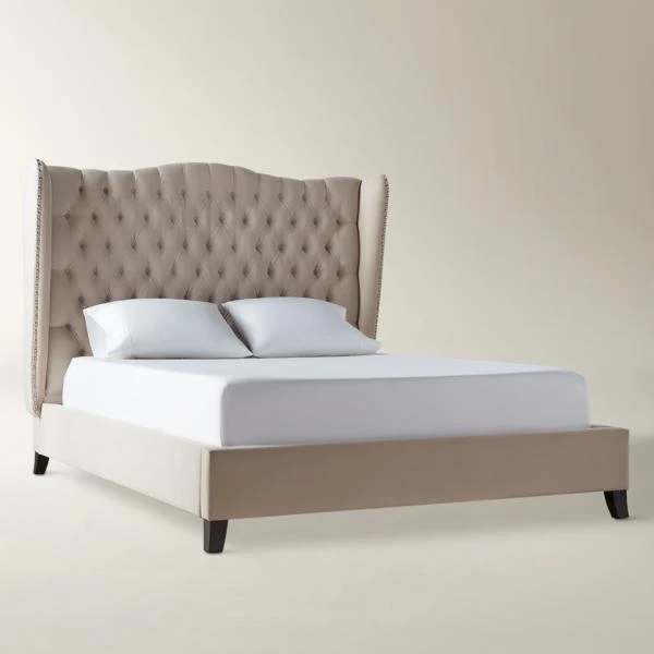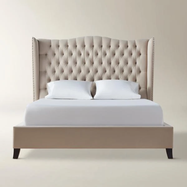 With its graceful camelback silhouette, deep, hand-applied button tufts, and plush padding, youâll rest luxuriously in our Jameson Bed. Trimmed with decorative nailheads, its winged sides and considerable height add a sense of opulence and drama to the bedroom. Shown in Bella Velvet Pearl with brushed silver nailheads.