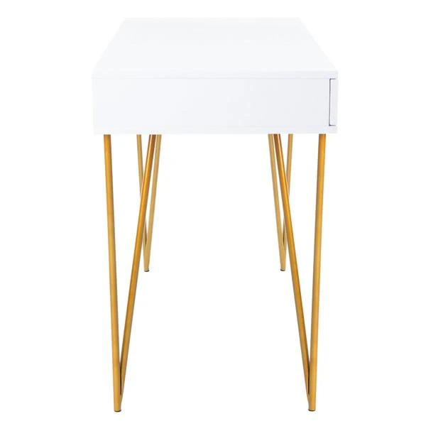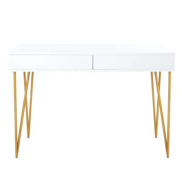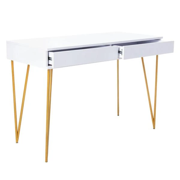 A natural beauty, this contemporary two-drawer desk brings form and function to the modern office. Its minimalist lines are highlighted by its white finish, while gold-finished hairpin legs add instant chic. Designers love its ample storage.