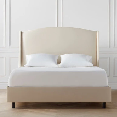 Crafted with a sturdy kiln-dried hardwood frame, this bed boasts a swooping, wingback-style headboard and neatly tailored upholstery. Mattress and box spring required. Made in the USA. Shown in Velvet Pearl.