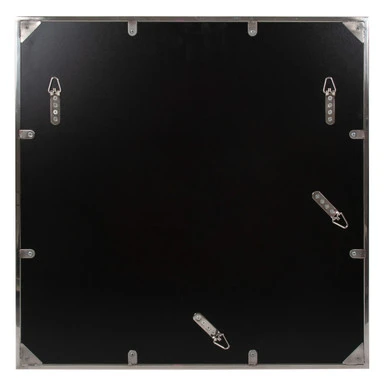 This square wall mirror is framed in blue beveled glass with polished stainless steel trim for a traditional yet modern look that works well with any style of decor.