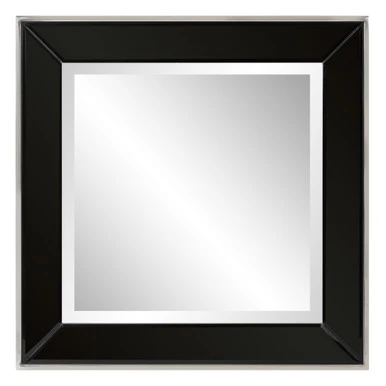 This square wall mirror is framed in black beveled glass with polished stainless steel trim for a traditional yet modern look that works well with any style of decor.
