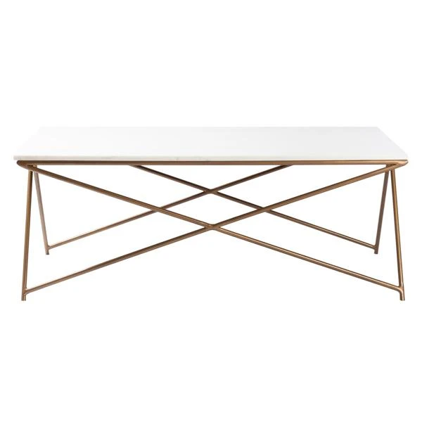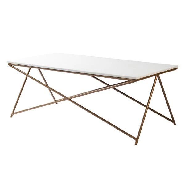 Our Lyon collections geometric legs provides visual interested to any room. A marble top is paired with a painted brass finish.