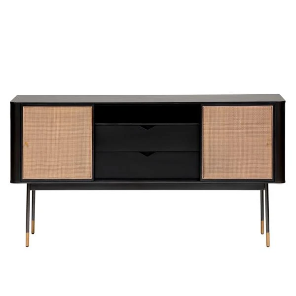 The Mabel Sideboard, with its contemporary lines, is as stunning as it is functional. This 59-inch sideboard features a solid wood outer frame and steel legs with bronze lower accents. There are two wicker sliding compartment doors with brass handles, that enclose ample space and shelves for convenient storage. The two center pull out drawers features smooth lower glides which gives the sideboard a clean and sleek look.