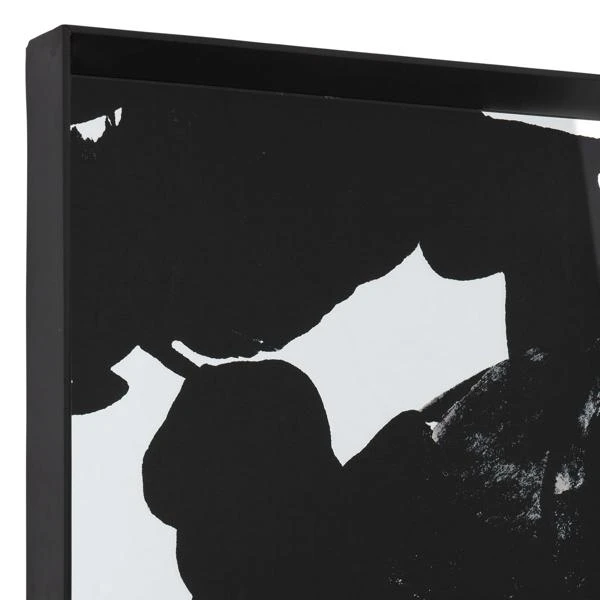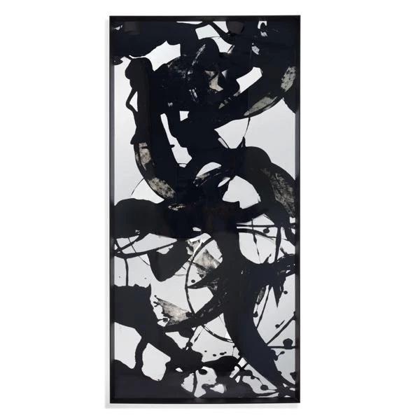 Our Mantra Art On Floor Mirror is rectangular with a clean modern black frame and a printed abstract black and clear glass motif. The hand crafted details produced by a skilled artist lends itself to a unique technique and will vary slightly.Â