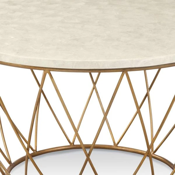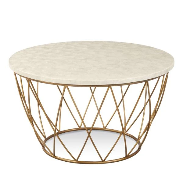 The Mara Round Coffee Table has a beautifully crafted Capiz top and metal base in gold finish.