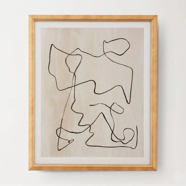 Our Maze art series features abstract ink scribbles on a cream background with white border and a simple natural wood frame.