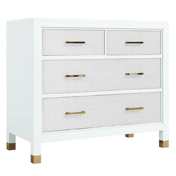 Boasting a clean-lined silhouette and gleaming brass-capped feet, the Monterey Dresser from Newport Cottages is outfitted with four soft-closing drawers that are inset with airy caned paneling for a refined look that works well in any space. Made in the USA.