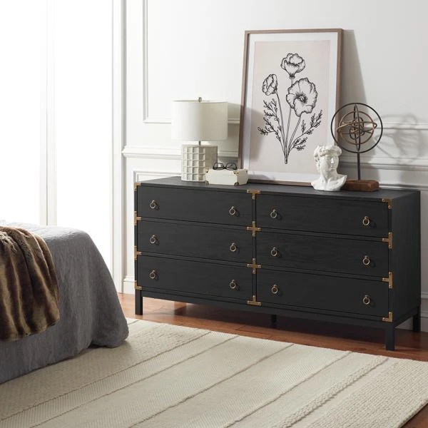 Keep your home organized and clutter-free with our charming and spacious Mylo dresser. Thoughtfully streamlined, the crisp and clean lines of our chest boast timeless aesthetics. It is gracefully perched and adorns a rich black veneer to enliven your home. Being inspired by the effortless beauty of vintage style, our chest is finished off with ring pulls and gold hardware on the edges. An elegant and timeless addition, the chest includes 6 drawers to store and organize all your clothing, linens, and accessories.