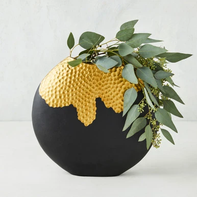 Whether it’s displaying blooms or serving as a decorative accent piece, this black-and-gold vase makes a statement on any shelf.Â
