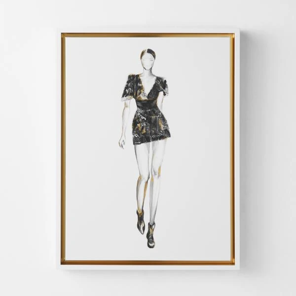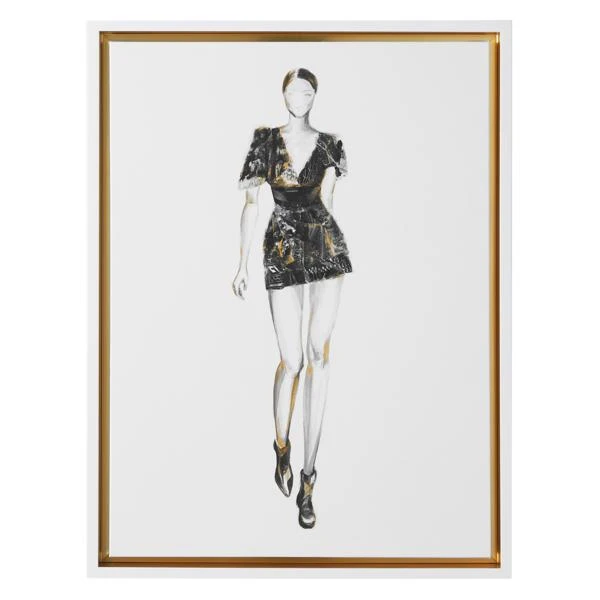 Small-scale in stature, but big on style, the On The Runway Series makes a fashion statement for sure. Each piece is created using giclee on canvas with a hand-applied image brush gel finish. They are framed in white floater frames with gold inner framing. On The Runway XI is #2 of 4 in a series.Â