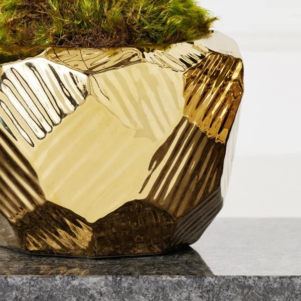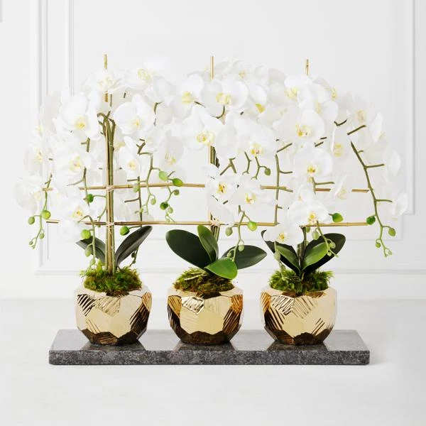 Introducing a show stopping centerpiece, this premade faux floral arrangement captures the essence of elegance with its lush orchids blooming in opulent gold pots, showcased atop a sleek granite slab, creating a captivating focal point for any space.