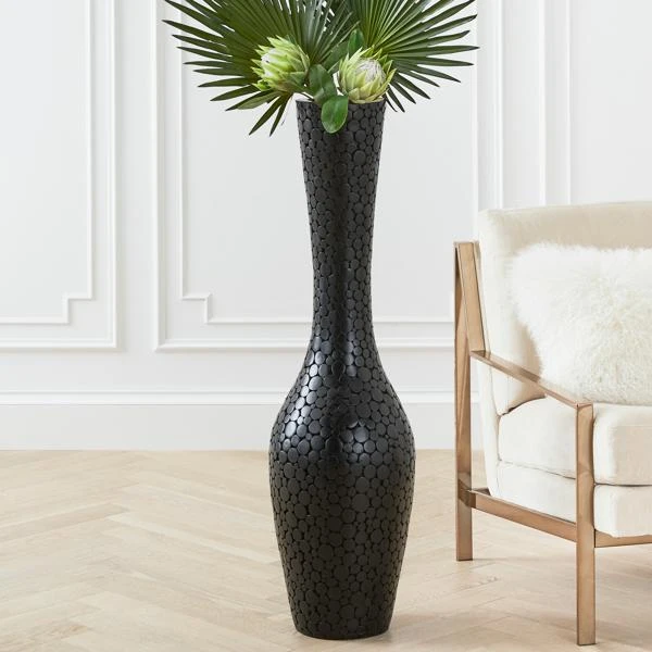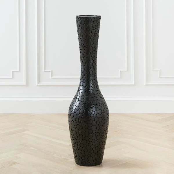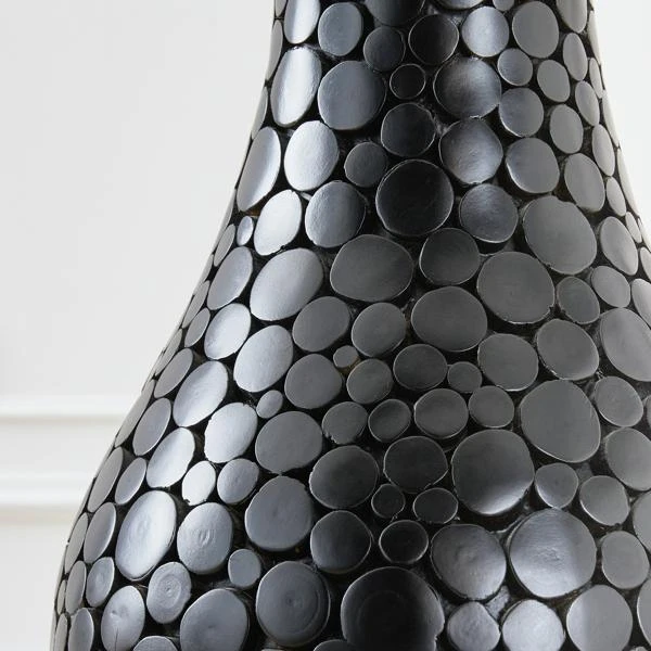 We’ve combined clean, contemporary design with the organic sensibility of natural materials to create our exclusive Black Oslo Vase. The simple shape of the large vase is crafted in a base of fiberglass, with a hand-applied overlay of intricately arranged flat coin-shaped pieces of wood. A smart glossy Black finish accents the modern appeal.