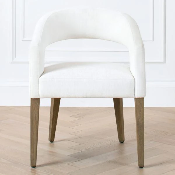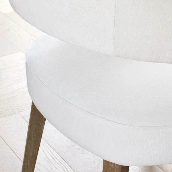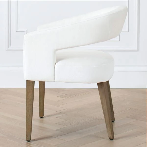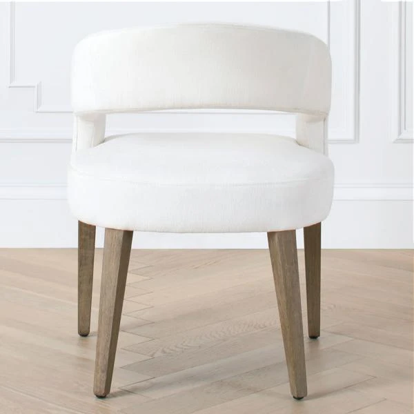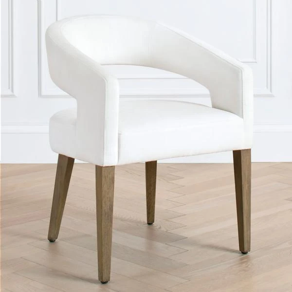 A curved silhouette, neatly tailored upholstery, and sleek back cutout make this eye-catching dining chair a standout piece. Shown in Kenley Chenille Snow.