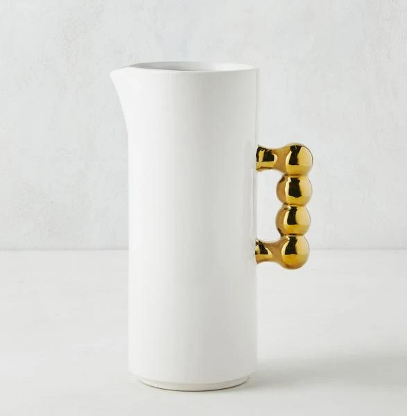 An eye-catching addition to any shelf or table. This pitcher is crafted of ceramic with a bright white finish and bauble handle in gold.