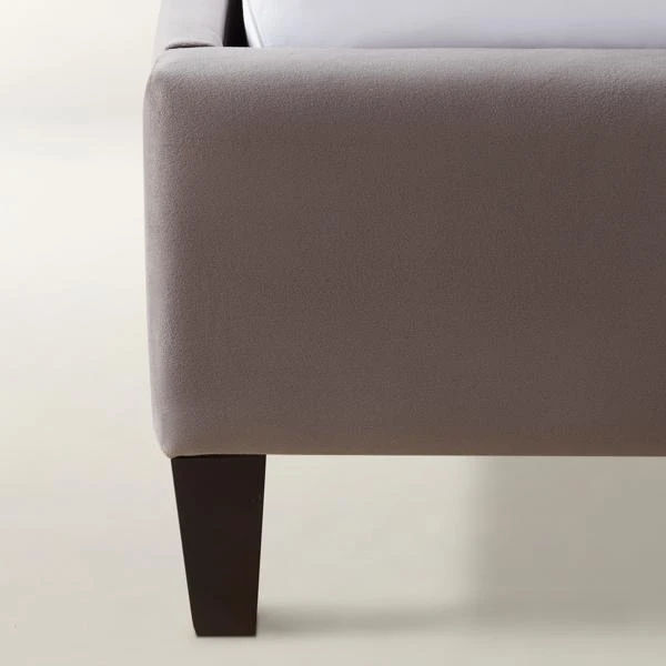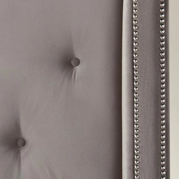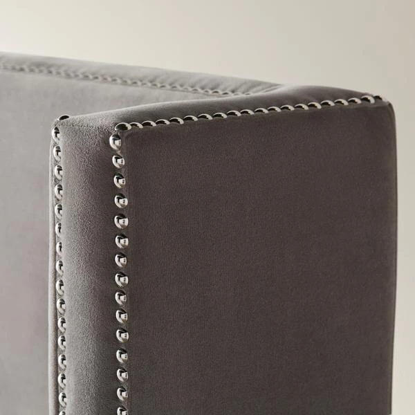 Our Porter collection elevates the comforts of your bedroom. The clean lines and modern details make a statement in the room. Shown in Bella Velvet Otter with bright nickel nailheads.
