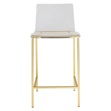 Sleek and modern, this pair of counter stools flaunt beautifully contoured clear acrylic seats atop clean-lined steel frames finished in matte, brushed gold.