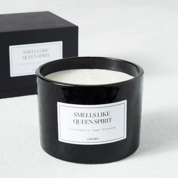 Presented in a black glass vessel with a tonal leopard print and sassy saying, this triple-wick candle features a fruity huckleberry sugar blossom scent and arrives in a handsome box, ready for gifting.