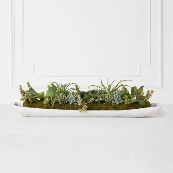 The premade arrangement of faux succulents in a long white wood bowl is a visually stunning and modern centerpiece that brings nature’s beauty into any space. The bowl, crafted from sleek white wood, adds a touch of elegance and simplicity to the arrangement.