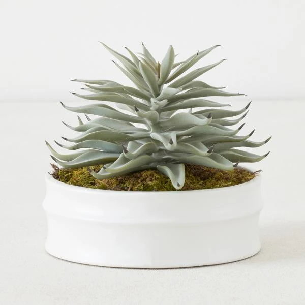 A visually stunning faux arrangement featuring a large single succulent in a round white bowl.