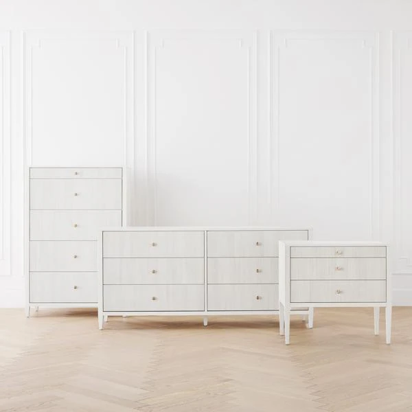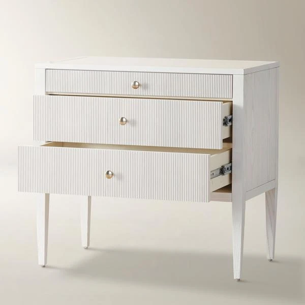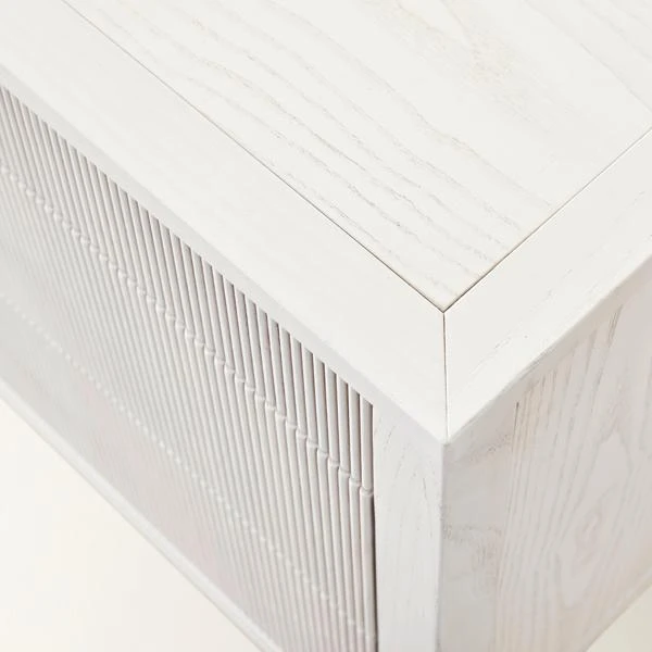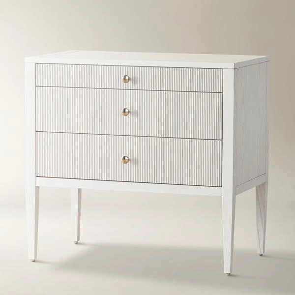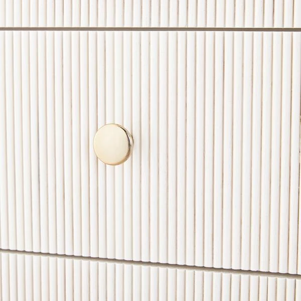 Elevate the style of your bedroom with our Viola nightstand. Featuring a sleek, modern silhouette and unique reeded drawer fronts, this nightstand is sure to catch your eye. The bone white finish and brass hardware add a touch of luxury to the overall design.