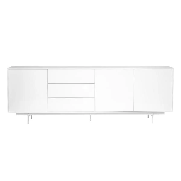 Designed with a streamlined silhouette, white lacquered finish, and white powder-coated metal legs, this sideboard adds a contemporary element to its surroundings. Three drawers and three doors with interior shelving offer ample space for storage.