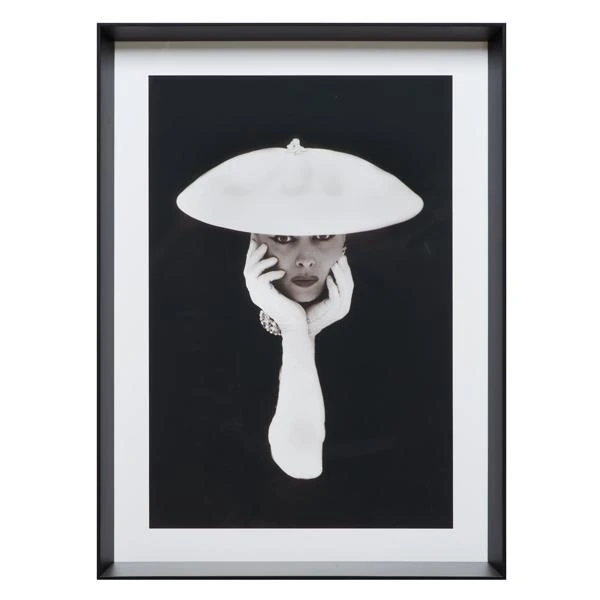 A glamorous portrait in black and white, this giclée print is displayed under glass in a matte black frame.
