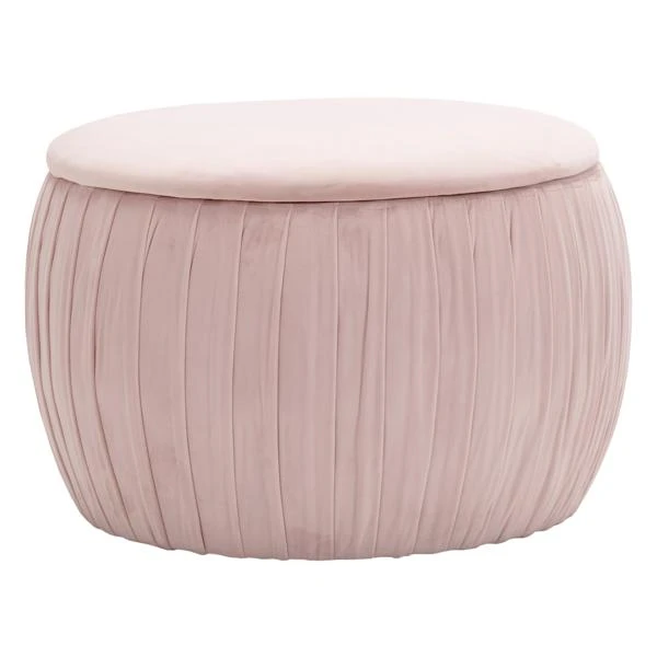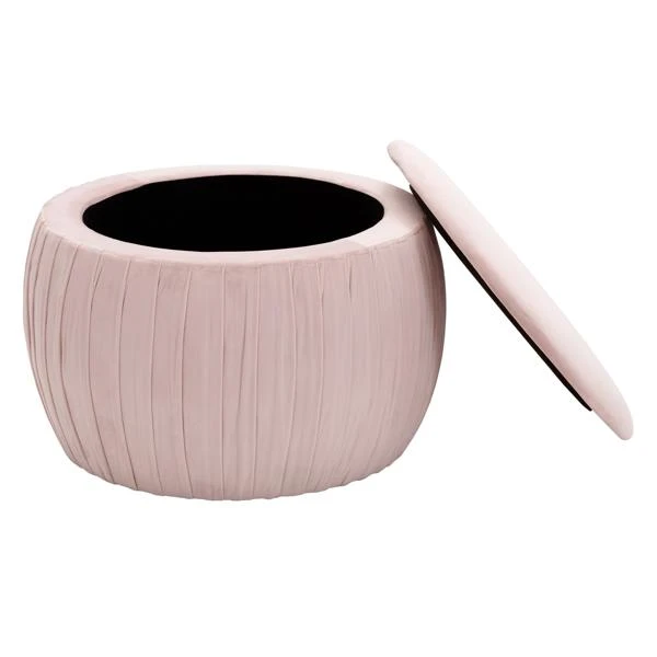 Pretty and practical, this ottoman is designed with a curved silhouette, pleated velvet upholstery, and removable top for storing blankets, toys, pillows, and more.